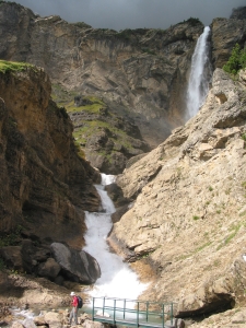 les flots torrentueux de la cascade. La passerelle annoncée dans le guide ne