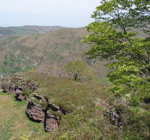 Justement, la voie bleue ne ressemble pas à notre souvenir, mis à part sa pente toujours aussi prononcée. Max s'est pourvu cette fois d'un coupe-coupe de bonne taille genre machette amazonienne appartenant à David pour dégager un chemin qui n'est pas encore envahi par la végétation étouffante qui nous avait tant fait transpirés : fougères et ronces pointent à peine, suffisamment quand même pour nous occasionner quelques bonnes griffures, avec la contribution des ajoncs en fleurs et de l'aubépine, aux épines acérées.