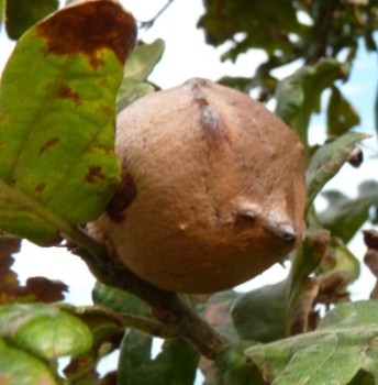 Pour Andricus foecundatrix, la perpétuation de l'espèce s'effectue en deux temps, avec deux types de galles et d'adultes, qui alternent des générations sexuées et asexuées. De quoi s'agit-il ? Nous avons donc notre drôle de galle aux allures de petite pomme de pin ou d'artichaut miniature qui se développe dans un bourgeon durant l'été. Quant elle est à son extension maximale, elle atteint 31 x 20 mm, et forme un groupe d'écailles de bourgeon élargies. Elle contient une galle interne ovoïde (un peu de la forme d'un gland de chêne pédonculé), qui remplace le méristème du bourgeon. De 6 à 9 mm de longueur, elle est d'un brun luisant, et contient une seule larve. Elle atteint sa taille maximale en août. Ensuite, les écailles s'entrouvrent, se dessèchent plus ou moins, se rétractent. La galle intérieure également arrivée à maturité tombe alors sur le sol, soit isolément, soit avec la galle-enveloppe. Elle demeure enterrée dans la litière durant un ou deux hivers, la larve à l'intérieur se transforme en pupe au printemps. C'est une femelle asexuée qui en émerge en mars ou avril de la première ou seconde année suivant l'expulsion de la galle interne. L'ancienne galle extérieure en artichaut peut persister sur l'arbre durant des années. A noter au passage que de nombreuses galles "avortent" (absence du noyau central, et donc de l'insecte).