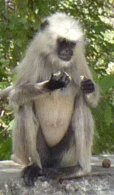 A la sortie du parking, une grande troupe d'Entelles d'Hanuman ou Langurs sacrés (Semnopithecus entellus) nous regardent passer. C'est toujours un choc de voir à quel point les singes ont des attitudes humaines (ou inversement) et combien leurs petits, hormis la queue, ressemblent à nos bébés. Les Hindous les vénèrent comme symboles du dieu-singe Hanuman, dont l'armée simiesque participa au sauvetage de Sītā,
