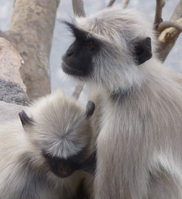 Sur le chemin du retour, nous voyons un troupeau de vaches rassemblées sur un rond-point triangulaire où leurs propriétaires ont jeté des brassées de verdure (des pieds de lentilles après en avoir prélevé les fruits, je présume). Un éléphant rentre au bercail sous la direction de son cornac qui devra raviver les couleurs des fleurs peintes sur le postérieur, les oreilles, la trompe et le front du grand pachyderme. Le soir, nous nous rendons près du lac Pichola à Gangori Ghat pour assister à un spectacle folklorique à l'intérieur de Bagore-ki-Haveli. Ce palais fut construit au XVIIIe siècle par le premier ministre du Mewar, Shri Amarchand Badwa, et il est transformé en musée depuis une vingtaine d'années. Les artistes qui se produisent dans ce lieu exceptionnel sont vraiment excellents. Nous apprécions d'autant mieux leurs performances que nous avons déjà eu une première expérience des musiques et danses du Rajasthan à un niveau plus amateur, en accord d'ailleurs avec le village où nous résidions, en plein désert du Thar. Cela commence fort, car la première - très jolie - danseuse évolue à deux pas de nous avec sur sa tête un chaudron d'où jaillissent des flammes et de la fumée. Dans un angle, un joueur d'harmonium et un percussionniste l'accompagnent en chantant. - Photo : Un jeune Entelle tétouille le sein de sa mère impavide. -