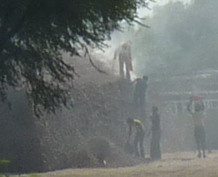 Sur des kilomètres avant Jaipur, des marbriers alignent des blocs fraîchement sciés. Des camions passent lourdement chargés de quelques pierres à livrer chez un sculpteur peut-être, ou pour un temple, un hôtel ou un immeuble pour de riches Indiens. Plus loin, de la fumée s'échappe d'un énorme monticule près duquel des gens s'activent, hommes et femmes. S'agit-il de la cuisson de briques ? Je lis un témoignage criant sur le travail des enfants en Asie, dans les briqueteries, mais aussi bien d'autres secteurs de l'économie. Comment peut-il en être autrement avec une démographie pareille ? Je trouve une étude intéressante sur ce sujet dont je tire les quelques extraits suivants. - Photos :Briqueteries. -