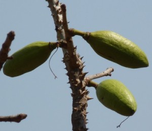 En contrebas, j'aperçois une retenue d'eau presque vide. Les arbres sont plus variés sur ces hauteurs. De grandes fleurs rouge vif jaillissent de rameaux nus. De petits fruits verts à l'allure de groseilles à maquereau mais couverts d'un fin duvet poussent en grappes serrées sur le tronc et les grosses branches d'un autre arbre à longues feuilles vert pomme. Sur des branches hérissées d'épines, de longs fruits verts et lisses ont une peau à l'aspect semblable à celle des avocats ou des figues, épaisse et un peu cireuse. Comme d'habitude, les rapaces planent infatigablement en suivant des routes invisibles d'air en lent tourbillon.