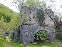 Mais malgré ses quatre fours, elle n'eut qu'une faible production, à cause des interruptions continuelles durant les guerres (cinq guerres qui s'échelonnèrent de 1793 à 1875), des destructions et des incendies fortuits. Des années durant, elle produisit des munitions, et à un moment donné, même des canons. Il faut avoir à l'esprit que le charbon de bois était un composant de la poudre à canon dont la qualité était déterminée par l'essence forestière utilisée pour sa fabrication, ainsi que par sa proportion dans le mélange avec le soufre et le salpêtre. C'était le charbon d'aulne qui était apprécié dans les poudreries françaises. Au milieu du XIXe siècle, elle se mit à fabriquer un fer de qualité qui était ensuite transformé dans les usines de Trubia et d'Oviedo dans les Asturies. Vivotant plutôt mal depuis l'incendie de 1869, elle finit par fermer ses portes en 1884, tandis que les "Altos Hornos" (Hauts-Fourneaux) prenaient leur essor. - Photo : Ruines de la fabrique d'armes : arcades au-dessus du río Legartza dont les eaux refroidissaient le matériel et actionnaient les martinets. - Ci-contre : Un des fours de la fonderie, au coeur de la fabrique, envahi de broussaille et, ci-dessous, nettoyé en vue d'une mise en valeur touristique. -