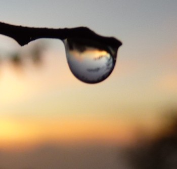 Le soleil a disparu derrière une pointe du croissant formé par la crête montagneuse contre laquelle se love la fertile vallée de La Orotava largement ouverte sur le grand océan. La nuit envahit l'île de Tenerife pendant que le ciel s'embrase avant de s'assombrir peu à peu à son tour. En fin de soirée, nous sortons de la ferme et traversons la propriété plongée dans l'obscurité. Cédric et Loreto résident désormais à Aguamansa, le plus haut village de la vallée de La Orotava, juste en limite du parc naturel du Teide, à 1200 m d'altitude. Nous prenons garde où nous posons les pieds. La lune joue à cache cache avec les nuages, impossible de deviner ne serait-ce que la silhouette des obstacles à contourner et la béance sombre de chausses-trappes à enjamber, sans parler des chats qui se faufilent insidieusement entre les jambes et des chiennes qui nous bousculent avec enthousiasme pour nous dépasser. - Photos : Puerto de la Cruz, vue depuis Aguamansa - Reflet du coucher de soleil dans une goutte de pluie -.