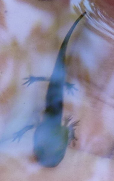 La période d'accouplement dure d'avril à septembre avec un pic d'activité en juillet. Après un accouplement réussi, la femelle garde en elle la semence du mâle durant plusieurs années. Cette stratégie de reproduction permet à la salamandre de donner de nouvelles générations sur de longues périodes sans forcément avoir de partenaire sexuel. La femelle ne se rend jusqu'à une zone d'eau qu'à la fin de la période embryonnaire (au bout de huit ou neuf mois), au printemps, afin de donner naissance aux larves. Celles-ci se nourrissent essentiellement de larves d'insectes, mais, comme pour les adultes, le principe général suivant peut être appliqué : tout ce qui a une taille inférieure est capturé ; ainsi une larve n'hésite pas à s'attaquer à un têtard et à recourir au cannibalisme durant une période d'absence d'autre nourriture. En 1928, l'herpétologue Magdebourgeois Willy George Wolterstorff (1864-1943) rapporta des observations de naissances de jeunes salamandres complètes (respirant grâce à des poumons) à Oviedo dans le nord de l'Espagne (Asturies). Cette découverte n'attira tout d'abord pas l'attention de la communauté scientifique, et ce n'est que dans les années 1970 qu'elle fut confirmée par d'autres collègues. Après l'avoir replongée dans son milieu vital, Dimitri recueille dans le creux de sa main contenant un peu d'eau un têtard de crapaud (alyte) accoucheur né l'an dernier, vu sa taille. Sa vitesse de développement est fonction de la température de l'eau. Sa métamorphose peut intervenir avant l'hiver (2 à 5 mois après l'éclosion) ou après l'hivernage (9 à 15 mois plus tard). Si Dimitri s'écoutait, il resterait toute la journée là à observer les êtres densément concentrés dans ce minuscule point d'eau. - Photos : Larve de salamandre tachetée - Triton palmé - Têtard d'Alyte accoucheur - Ci-dessous : Triton palmé femelle - Larves de salamandres tachetées (?) -