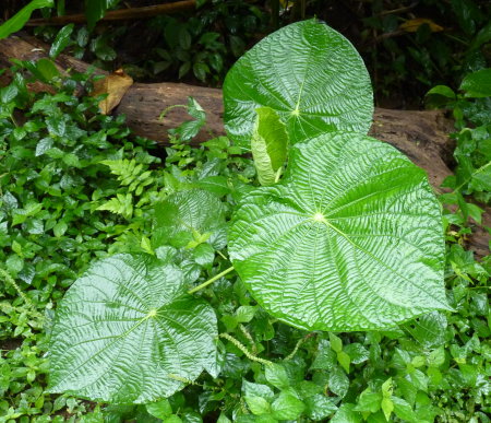 Nous faisons connaissance avec les routes à deux voies seulement, plutôt étroites en général. Nous nous rendons près de Puerto Viejo, à Gavilan Lodge en bordure du fleuve Sarapiqui situé de l'autre côté de la chaîne de montagne centrale. Dans la longue montée, la route est en réfection, ou bien en agrandissement à l'espagnole, en rapant la montagne sur une grande hauteur. Au lieu de procéder par courts tronçons, de façon à ne pas trop gêner la circulation, les travaux se font sur des kilomètres. A un moment donné dans la montée, nous nous trouvons bloqués par un feu sans savoir quand il tournera au vert (un quart d'heure, une demi-heure, une heure d'attente, davantage ?). Nous apprenons la patience et le détachement. Les nuages rampent sur les reliefs, une bruine sourd par moment et le paysage s'estompe. Lorsque nous franchissons cet obstacle en roulant au ralenti sur la piste caillouteuse, nous voyons changer la végétation, les feuilles des plantes deviennent énormes, au diamètre couramment supérieur au mètre, je rêve à la vue de fougères géantes, des cascades ruissellent de partout, il y a aussi des fougères arborescentes, un fouillis de plantes luxuriantes, très vertes, très denses. C'est vraiment magnifique, dommage qu'il y ait si peu de lumière dans ce brouillard mouvant. Nous avons tant perdu de temps que nous ne pouvons faire halte pour profiter un peu de ce premier dépaysement. - Photo : Gunnera insignis (Sombrilla de pobre, ombrelle du pauvre) qui pousse au bord du cratère du volcan Irazú - Epiphyte à Gavilan Lodge, près du Río Sarapiquí, versant caribéen -