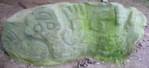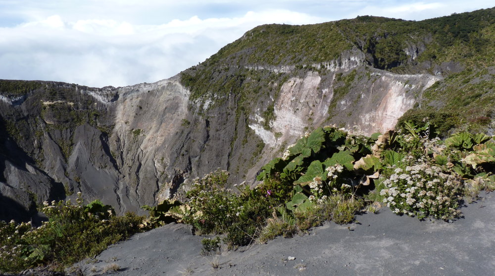 Pourtant, l'usage de cette appellation du volcan est relativement récent, elle n'est pas mentionnée dans les documents des XVIe et XVIIe siècles, où il est désigné par "volcan de Carthage" (Cartago, la ville en contrebas). Par contre, il existe un nom de famille en basque, Irazú, qui signifie « lieu de fougères » et sur les contreforts du volcan les fougères arborescentes se trouvent facilement. Peu après notre retour en France, le 12 mars, alors que nos deux Suissesses prolongent leur séjour et visitent la côte caribéenne, le volcan Turrialba voisin d'Irazú entre en éruption, éjectant tellement de cendres que l'aéroport situé à une trentaine de kilomètres à vol d'oiseau doit interrompre son activité pendant un jour ou deux. Une nouvelle éruption a lieu le 4 mai, avec éjection de gaz, de cendres et de pierres. Nous avons eu de la chance, car nous étions hébergés les 6 et 7 mars sur son flanc pour être à proximité du site archéologique "Monumento nacional Guayabo" où nous nous sommes rendus. - Photos : Cratère Diego de la Haya avec les traces d'un lac résiduel (Volcan Irazú) - Monolithe du Jaguar et du Lézard (Site archéologique Guayabo) - Feuille à contrejour devenue une vraie passoire, dévorée par les insectes - Ci-dessous : Cratère principal du Volcan Irazú aux abords très fleuris -