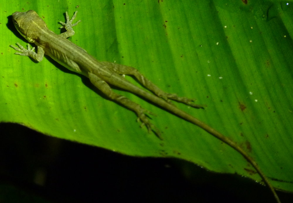 Revenant près de l'entrée, nous voyons un renard gris passer devant nous et disparaître dans les fourrés. C'est le plus petit du monde, dit le guide, et le seul canidé à grimper aux arbres (avec le chien viverrin originaire d'Asie orientale toutefois). Il a acquis comme adaptation à la vie dans la forêt des griffes rétractiles comme les chats. Le guide se penche sur un massif de plantes à grandes feuilles et nous montre à toute vitesse divers batraciens, avec ou sans queue, une minuscule grenouille verte, une sorte de salamandre toute aussi cryptique, vert sur vert, aux curieuses pattes effilées, une autre à la queue bicolore, une deuxième mini-grenouille, rousse cette fois. Nous montons un peu et, à une intersection, il s'arrête pour nous signaler la présence d'une mygale ("tarantula" en anglais) terrée dans son trou, effrayée par les flashes du groupe qui nous a précédés. C'est un animal timide qui se cache quand il prend peur. La femelle vit de 10 à 20 ans, plus longtemps que le mâle (de 3 à 7 ans de plus). Elle vit la majorité de ces années après avoir atteint sa maturité, tandis que le mâle, après avoir subi la transition qui l'amène de l'état sub-adulte à celui d'adulte, n'a guère plus de dix mois à vivre.