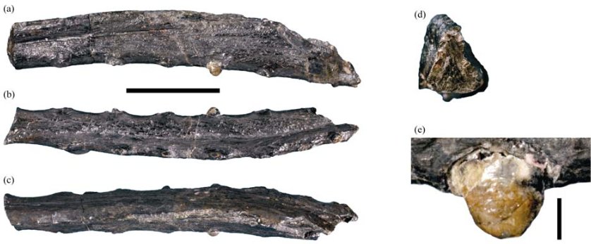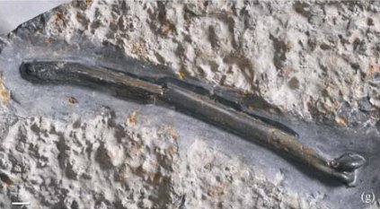 Les restes fossiles (un assemblage de 186 ossements au total, dont certains étaient issus de vestiges crâniens et post-crâniens désarticulés appartenant à plusieurs individus ptérosaures - au moins 5 adultes et subadultes) furent exposés avec une reconstitution de l'animal au Centre Paléontologique d'Enciso (Pérez-Lorente et al., 2001), puis une exposition itinérante fut présentée en plusieurs lieux de la Péninsule, y compris La Rioja et Burgos. Après avoir été pendant une décennie un "nomen nudum" (nom qui pourrait devenir scientifique, mais qui demeure en attente d'une publication avec une description adéquate pour être inscrit dans la nomenclature), les deux chercheurs publièrent leur découverte en 2010. - Photos : Agrandissement montrant le rostre de l'holotype du Prejanopterus curvirostris - Métacarpe gauche de l'aile, pris pour un tibia par Fuentes Vidarte et Meijide Calvo -