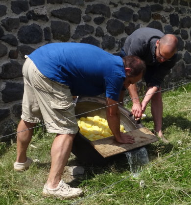 4°) Dans le récipient où ont cuit les pommes de terre, mettre du beurre 5°) Verser la purée, de la crème fraîche et du sel 6°) Par poignées successives, sans cesser de touiller, ajouter la tome fraîche de l'Aubrac broyée, jusqu'à obtenir une consistance sirupeuse 7°) Consommer sans modération ! |