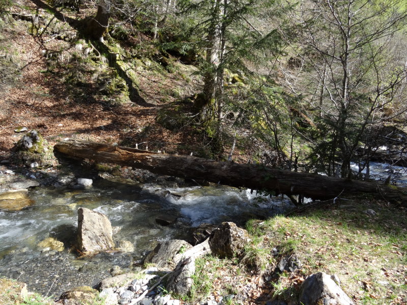 Nous marchons à flanc de montagne, sous une falaise qui forme un premier contrefort du Pic de la Gentiane et au-dessus d'un torrent qui bondit en cascades sonores, l'Arrec de Besse. Arrivés sur un méplat, nous traversons une tourbière maculée de bouses de vaches et poursuivons l'ascension jusqu'à une large vallée où persistent des névés. Dans la neige, des traces de chevreuil s'éloignent vers le haut. Nous poursuivons la montée jusqu'au plateau de Besse où nous pique-niquons. Ce faisant, Jean-François nous raconte qu'un jour, Jean-Jacques Camarra mangeait devant la cabane de Besse que nous apercevons au loin, minuscule au centre de l'alpage entouré d'un cirque de montagnes. Tout d'un coup, il vit passer un ours (prénommé Lagaffe, car il faisait des bêtises tout comme le personnage de bandes dessinées). Celui-ci fut ultérieurement piégé au lacet pour lui fixer un collier avec une balise émettrice, car il provoquait la panique parmi les troupeaux de brebis. Tandis que nous l'écoutons, le grondement d'une avalanche nous fait sursauter. Elle est loin toutefois et n'arrive même pas au bas de la falaise. Deux autres dégringolent à sa suite : c'est le printemps, la neige fond. Loin dans le ciel au-dessus des falaises dénudées, un gypaète traverse l'espace et disparaît derrière les crêtes. - Photo : Jean-François aide Jacques à traverser l'obstacle -