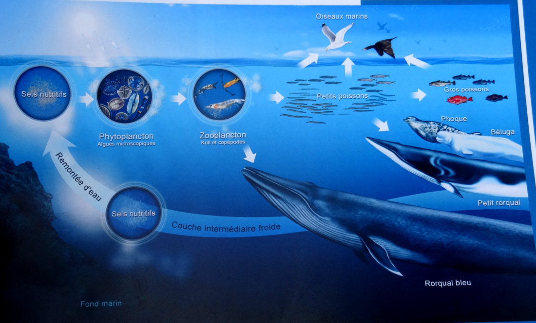 4) "C'est ici, à l'embouchure du Saguenay, que l'on trouve d'énormes bancs de petits organismes et de poissons. Cette concentration de proies expliquerait la présence de nombreux mammifères marins près de Tadoussac. Circulant en profondeur et remontant le Saint-Laurent, un grand courant est freiné dans son avancée par le relief sous-marin en face de Tadoussac. Les énormes quantités de petits animaux qu'il transporte s'y concentrent. D'immenses bancs de plusieurs kilomètres de longueur et pouvant atteindre plus de 100 m d'épaisseur se forment alors. Ces rassemblements sont principalement composés de petits crustacés tels le krill et le copépode. Ces petits animaux, qui ne se déplacent qu'avec le courant, composent la base de l'alimentation de plusieurs espèces marines. De petits poissons sont aussi attirés vers ces grands bancs de crustacés pour se nourrir. Les mammifères marins semblent tirer profit de ces regroupements pour s'alimenter, consommant à la fois poissons et plancton. Les milliards d'organismes se trouvant à Tadoussac, avidement recherchés par les baleines, ne sont donc pas produits sur place. Ils proviennent du golfe du Saint-Laurent à quelques centaines de kilomètres de là." - Photo ci-dessous : Faune estuarienne -
