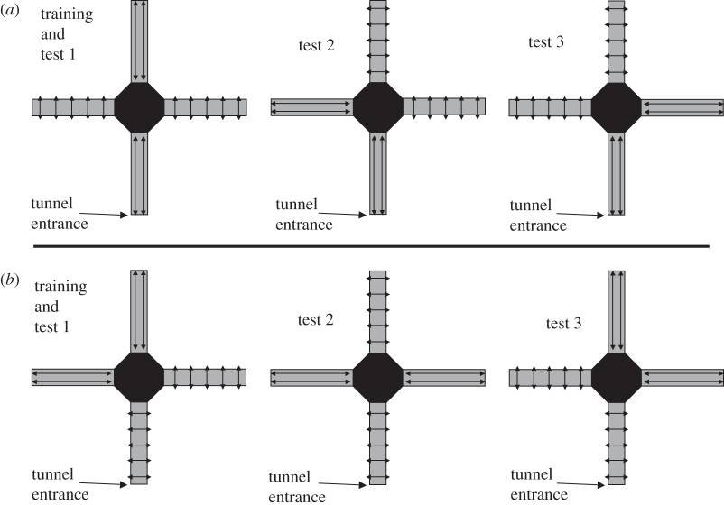 Une expérience a été réalisée par des chercheurs australiens du Queensland. 4 tunnels convergent vers une chambre de décision. Le "plancher" est recouvert d'une feuille blanche amovible et les "murs" latéraux d'un damier imprimé sur une surface lavable. Pourquoi ces précautions ? C'est que l'abeille informe ses demi-soeurs non seulement par la danse d'orientation, mais également en émettant des phéromones grâce à une glande située entre les deux derniers segments de son abdomen. Si l'on veut être sûr que l'abeille suivante ne s'oriente qu'en fonction de la lumière polarisée émise au "plafond", il faut éliminer tout indice de passage de celle qui l'a précédée dans les tunnels. Un animal qui marche, comme la fourmi, a dans son corps un moyen d'évaluer la distance parcourue (en fonction de la fatigue musculaire, du décompte des pas ou tout autre moyen que l'on ignore). Par contre, l'abeille évalue la distance qu'elle parcourt en volant grâce au paysage qui se déroule sous son regard. Les damiers aux motifs très serrés simulent pour l'abeille une grande distance, alors que, bien sûr, les tunnels ont une longueur bien inférieure à ses parcours habituels. Au bout de chaque tunnel, il y a un écran blanc, et derrière un seul des trois écrans, une coupelle d'eau sucrée en récompense pour avoir réussi le test auquel l'abeille est soumise.