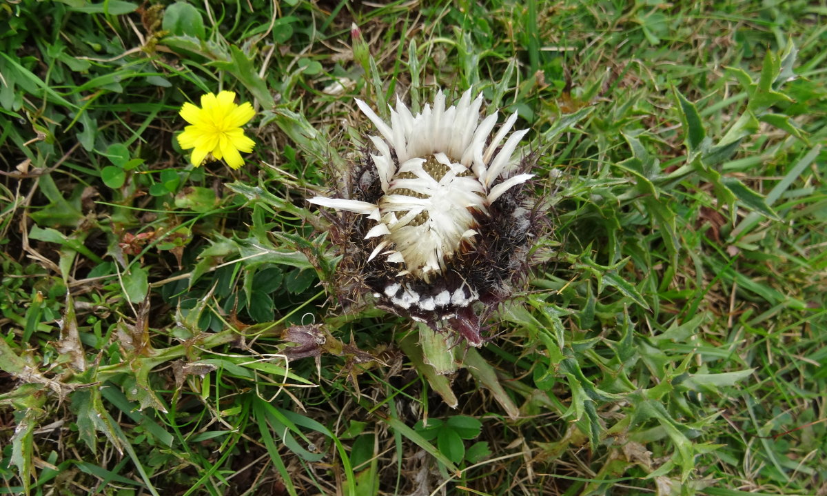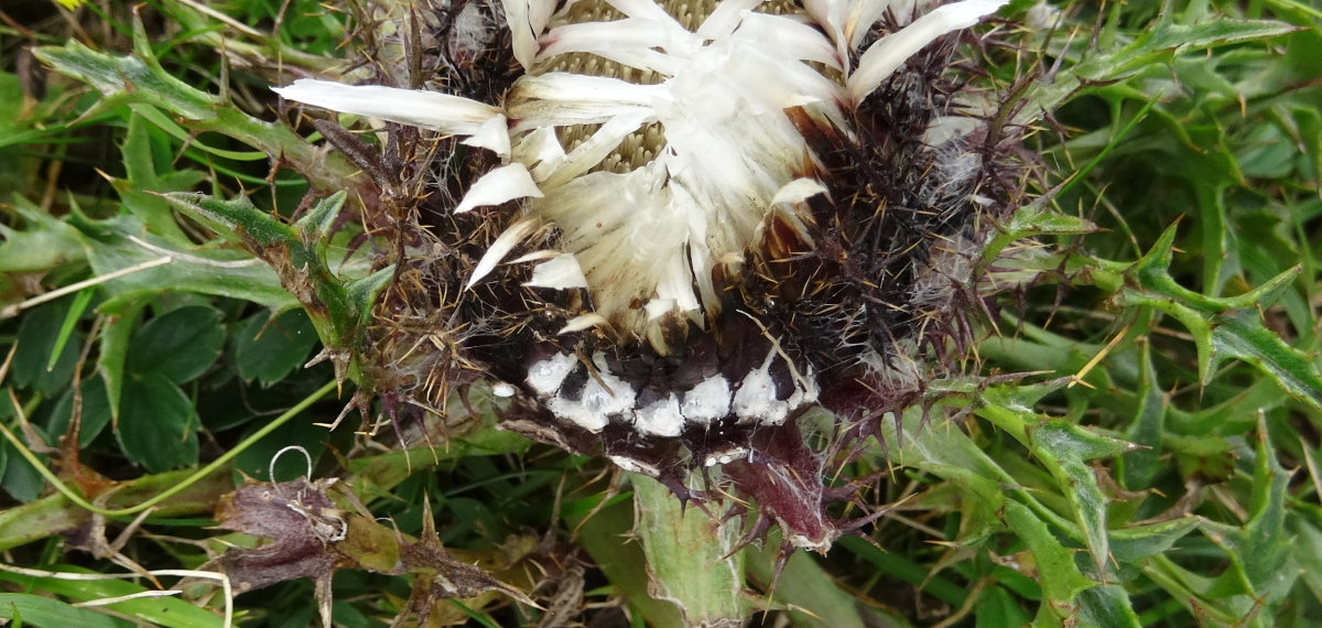 Carline acaule (Carlina acaulis), encore une Astéracée (ou Composée): Le qualificatif "acaule" signifie que le capitule ne possède pas de tige apparente, reposant directement sur la rosette des feuilles.