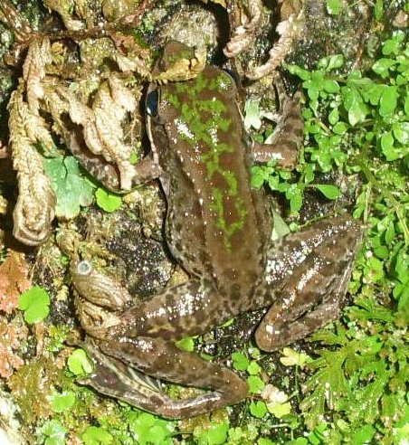 Le cours d'eau que nous longeons est un affluent mineur de la Liwu. Son niveau d'eau varie avec les saisons. Durant la saison des pluies, le flux est rapide, mais le lit est presque à sec durant les longues périodes de sécheresse. Même quand il y a peu d'eau, elle reste fraîche et claire et cela attire toute une kyrielle de visiteurs. Pendant la marche, il se peut que l'on entende un son roulé qui semble venir d'un oiseau, mais c'est en fait le chant de la charmante grenouille Swinhoe (Rana narina swinhoana). Elle se tient au milieu du courant grâce à ses disques qui font ventouse sous ses pieds et la maintiennent sur la roche glissante. On peut aussi croiser une libellule ou une demoiselle qui surgit, toujours pressée, ou bien encore observer l'exuvie (squelette extérieur) de ces insectes déchirée au cours de la mue après leur précédente période de vie sans ailes et emportée par le courant. Il y a beaucoup d'autres insectes aquatiques, comme l'Ephémère de Formose (Ephemera formosana) et les Trichoptères (Trichoptera) qui se tiennent sur les pierres dans l'eau. Leur présence, ainsi que celle des plantes, sert d'indice pour évaluer la pureté de l'eau. - Photo : Grenouille Swinhoe (Rana narina swinhoana) -