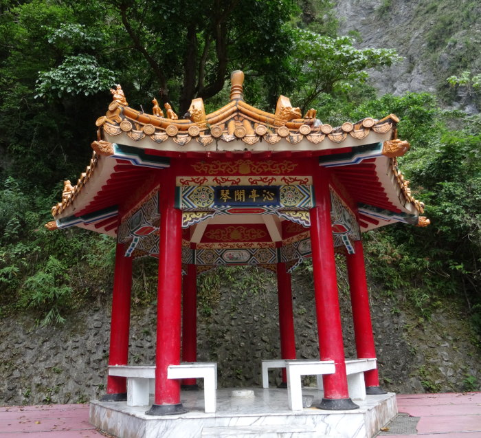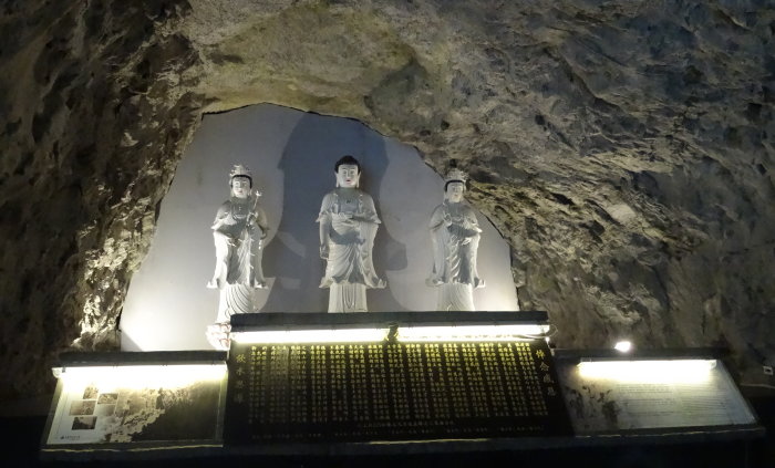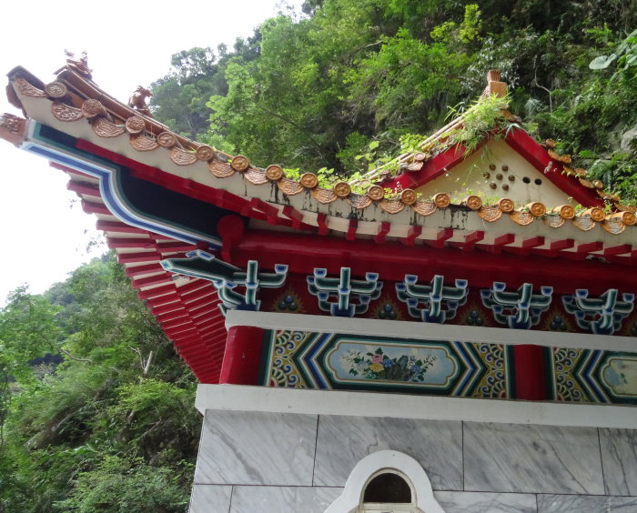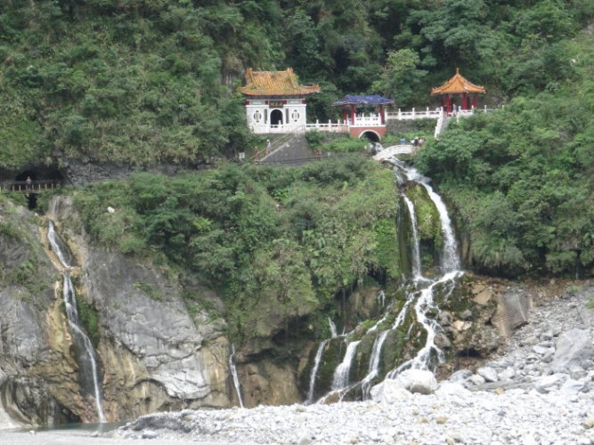 Ce que nous ignorions totalement en venant là, c'est que le tombeau Changchun "de l'Eternel Printemps" (長春祠), que j'avais pris initialement pour une simple chapelle, a été construit à la mémoire des 226 ouvriers qui moururent dans des accidents de travail durant la construction de cette autoroute. Le tombeau fut achevé à la fin 1957 et reconstruit à deux reprises, à chaque fois parce qu'il avait été gravement endommagé par un glissement de terrain, d'abord en 1979, puis en 1987. La roche sur laquelle est bâti le tombeau du Printemps éternel est un mélange de schiste vert, de marbre fin et de schiste de quartz. Elle est fragile et rendue plus instable en raison de la présence d'une faille qui la traverse. En plus, l'eau de la Liwu érode continuellement le pied de la pente. Les "Sources jaillissantes du Printemps éternel" au-dessous du tombeau sont alimentées en permanence par l'eau infiltrée à travers les fentes de la roche. Après un typhon ou de fortes pluies, leur volume augmente à un point tel qu'elles s'écroulent sur le roc dans un fracas de tonnerre. Même lorsque les pluies sont minimales, le flux s'amenuise mais ne s'arrête jamais. La reconstruction du tombeau fut achevée à gauche du site originel en 1989, avec une architecture différente des précédentes versions. - Photos : Grotte Guanyin à l'entrée du site avec les noms des ouvriers décédés dans des accidents pendant la construction de la route - Ci-dessous, le tombeau déplacé à gauche de la pente à éboulis -